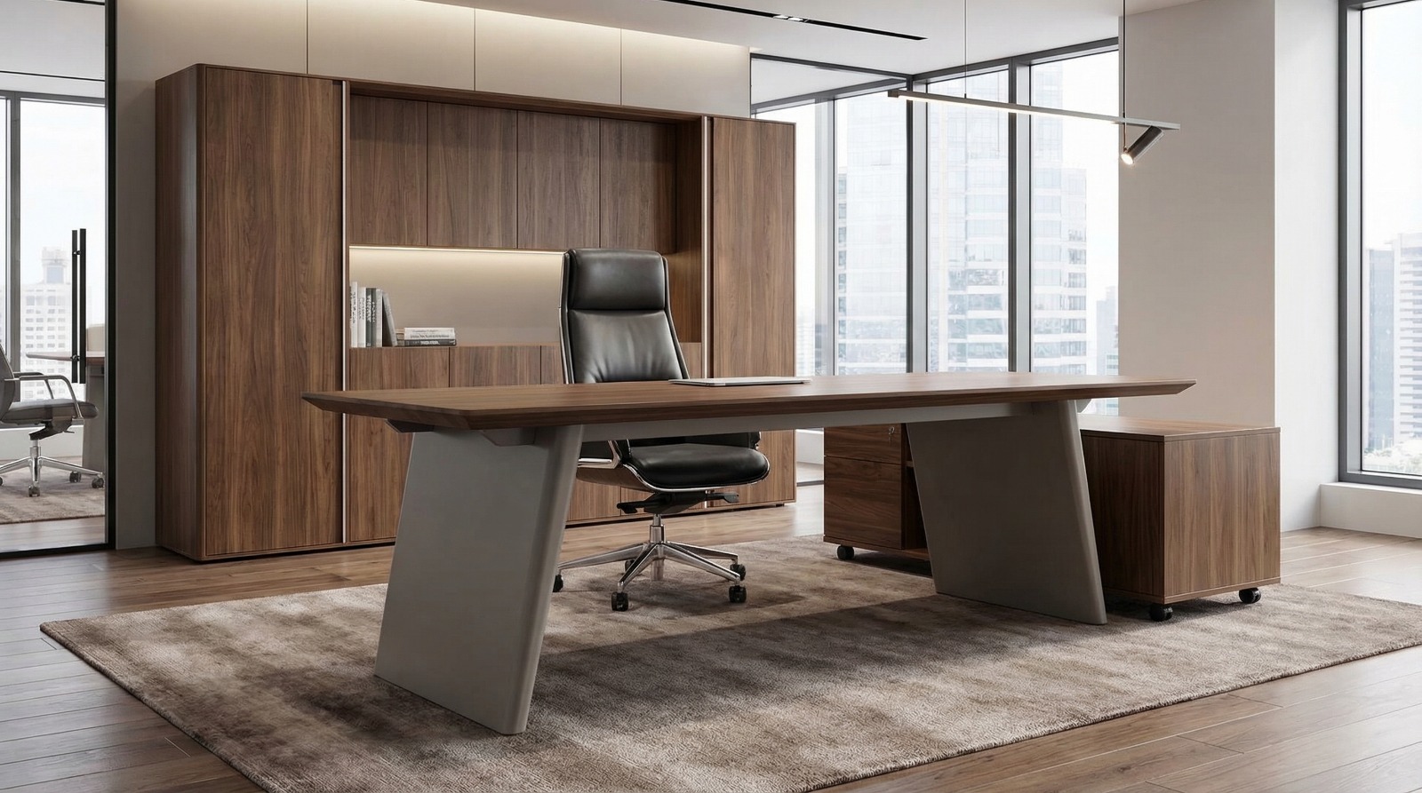שולחן מנהל יוקרתי, פלטה פורמייקה שיש בגימור מבריק, רגליים וסינר קדמי פורמייקה בצבע שחור. ארונית שלוחה הכוללת זוג דלתות ומגירות. *המחיר תלוי במידה, צבע...
